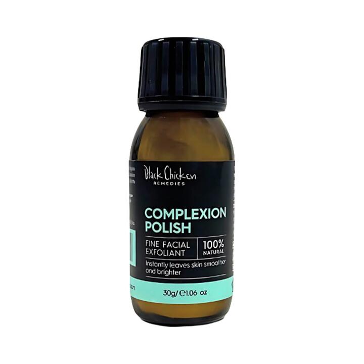 Black Chicken Remedies Complexion PolishAn award winning 100% natural face exfoliator designed to instantly smooth, brighten and revive your skin. Black Chicken Remedies 100% natural powder facial exfoliant is made from finely milled extracts from mother natures pharmacy. It will visibly revitalise your face in less than a minute by gently exfoliating and removing dull build-up to reveal a smoother, renewed complexion. Mix with water or Cleanse My Face Purifying Oil to create a paste to exfoliate the skin.Exfoliating is an important part of a good skincare routine. Our natural face exfoliator delivers all sorts of benefits including: A natural, gentle face scrub to remove impurities and dead skin cells which helps to tone, refine and boost cell renewal. Formulated to nourish your skin rather than leaving it to feel dry and stripped bare of your natural oils Expertly combined ingredients to promote a smoother, plumper and more radiant complexion What will it do? Instantly leaves skin smoother and brighter Reduces the appearance of large pores Lightens and minimises the effects of age and sunspots Helps clear acne & breakouts Assists the absorption of serums and moisturisers No water, no additives, no fillers, no preservatives, and NO plastic microbeads! For men it’s a pre-shave essential. It revives skin and makes it more even by lifting beard hairs and helping to reduce ingrown hairs, clearing the way for a closer, nick-free shave.