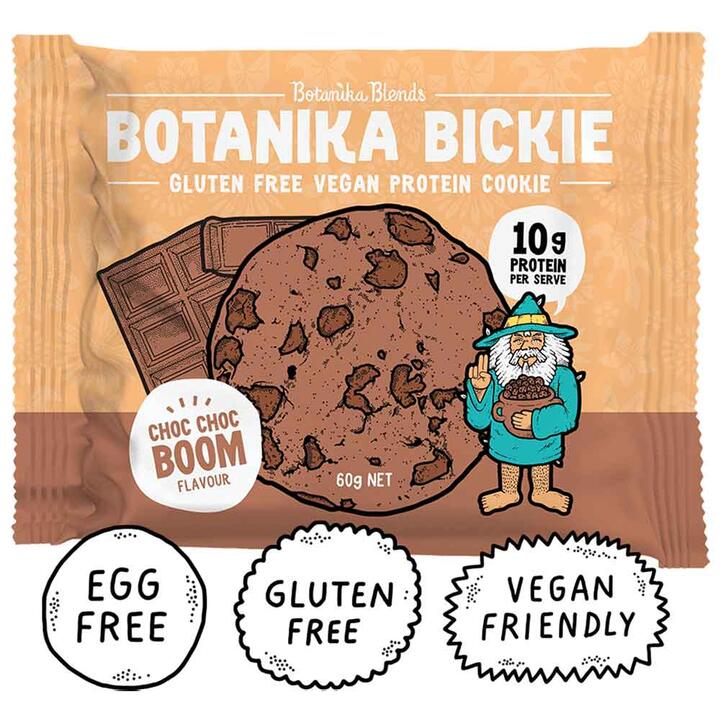 Botanika Blends Bickies are crunchy, flavoursome and loaded with 10g of plant-based protein per serve. Choc Choc Boom features a rich chocolate biscuit with delicious dark chocolate chunks. No artificial flavours, colours or sweeteners. Gluten, egg and dairy-free. Palm oil free.