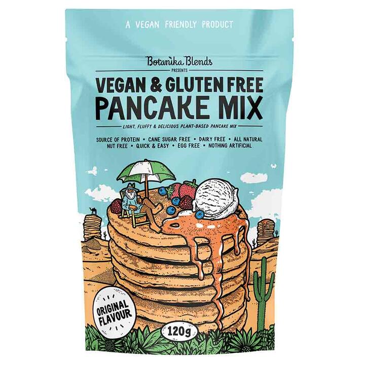 Botanika Blends Original Pancake Mix Botanika Blends’ Original Pancake Mix is vegan, plant-based and packed with protein derived from faba beans. This mix makes light, fluffy and delicious pancakes that you can customise. We recommend topping off your pancakes with fresh fruits, maple syrup, ice cream or aquafaba whipped cream. Made from brown rice flour, coconut milk, corn flour and naturally sweetened by monk fruit. Benefits: Source of protein Cane sugar free Gluten free Dairy free All natural Nut free Egg free No artificial colours, flavours & sweeteners Packaged in a recyclable plastic bag.