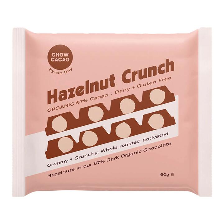Chow Cacao Dark Chocolate Block – Hazelnut Crunch is creamy and crunchy hazelnut legend. 67% organic dark chocolate with whole activated, crunchy hazelnuts.