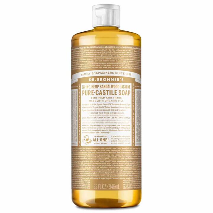 Dr. Bronner’s 18-in-1 Pure-Castile Magic Soap – Sandalwood & Jasmine is a versatile, all-in-one castile soap that cleanses your body, home, and more with a single, eco-friendly formula made from organic and fair-trade ingredients. With warm, woody, and fresh jasmine notes, it contains Regenerative Organic Certified coconut, olive, jojoba, and hemp oils, creating a rich, creamy lather that gently cleanses without drying, leaving skin soft and refreshed. Packaged in 100% post-consumer recycled plastic, it is as ethical as it is effective. Whether you’re cleansing your body, face, hands, or hair, shaving, or cleaning household surfaces, this soap is a truly multi-purpose, eco-conscious essential. 3x more concentrated than most liquid soaps, a little goes a long way—just dilute as needed. Vegan, cruelty-free, and EWG Verified, it’s kind to your skin and the planet. Why you’ll love it: Warm and woody scent Multi-use formula for body, face, home, and more Concentrated formula that lasts longer Made with organic and fair-trade ingredients Vegan, cruelty-free, and EWG Verified Packaged in 100% post-consumer recycled plastic