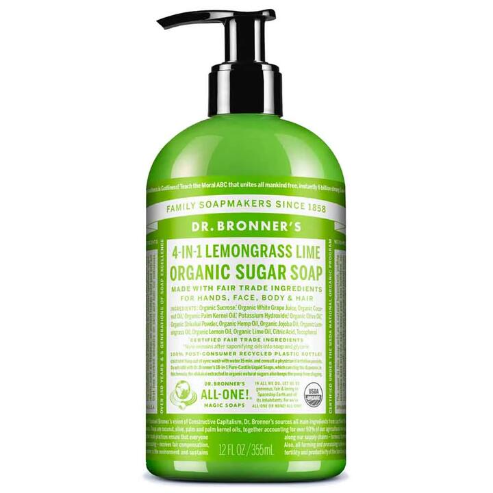 Dr Bronner’s 4-In-1 Lemongrass Lime Organic Pump SoapThe amazing scents of lemongrass and lime can be found in this hand and body wash. This organic castile-soap can be used on face hair, hands and body. Organic Shikakai is a gentle conditioning cleanser for the skin while moisturising and hydrating properties of Coconut and Jojoba Oil combine with antioxidant rich Hemp Oil to leave your skin feeling beautifully soft.Certified Organic to USDA National Organic Program and Fair Trade Standards.