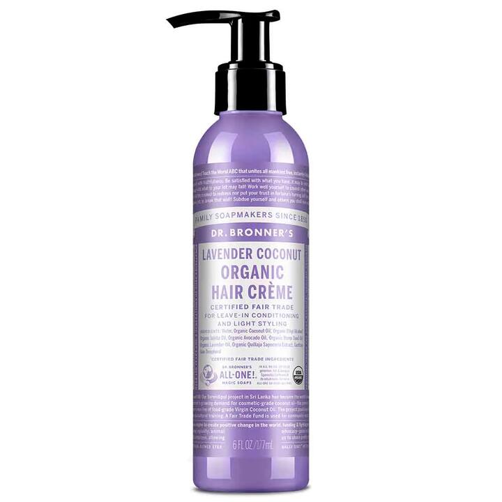 Dr Bronner’s Organic Hair Creme in Lavender & Coconut, for leave-in conditioning and light stylingDr. Bronner’s Organic Hair Cremes provide light styling hold, make hair silky soft without any synthetic ingredients! Organic coconut oil gives hair shine and strength, organic jojoba oil imparts manageability and feel, and organic hemp oil moisturizes and softens hair. Use as part of an organic hair care routine, together with Dr Bronner’s Organic Pump Soaps and Organic Hair Rinse.Certified Organic to USDA National Organic Program and Fair Trade Standards.