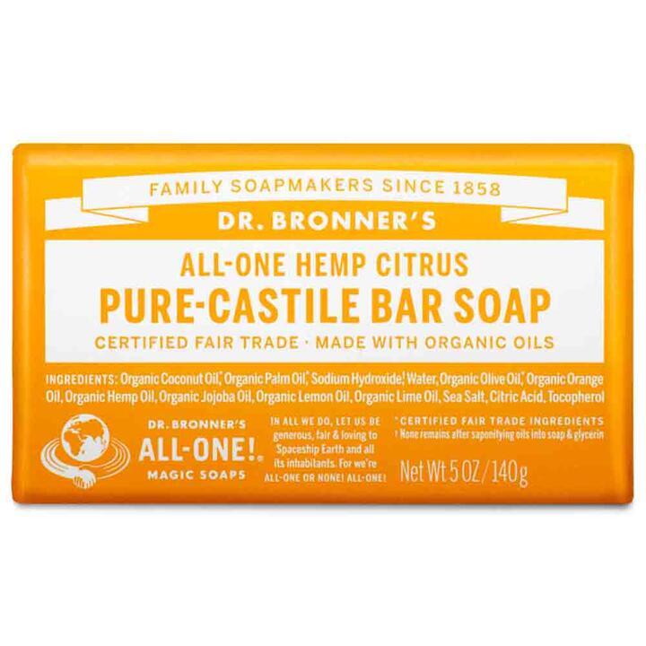 Dr Bronner’s Original Castile Bar Soap in Citrus & Orange. Citrus has an invigorating blend of organic orange, lemon and lime oils! Our Citrus Pure-Castile Bar Soap is made with certified fair-trade ingredients and organic hemp oil for a soft, smooth lather that won’t dry your skin. 100% biodegradable in a 100% post-consumer recycled wrapper.Dr. Bronner’s Pure-Castile Bar Soaps are biodegradable, vegan, gentle and versatile. Great for washing your body, face and hair!