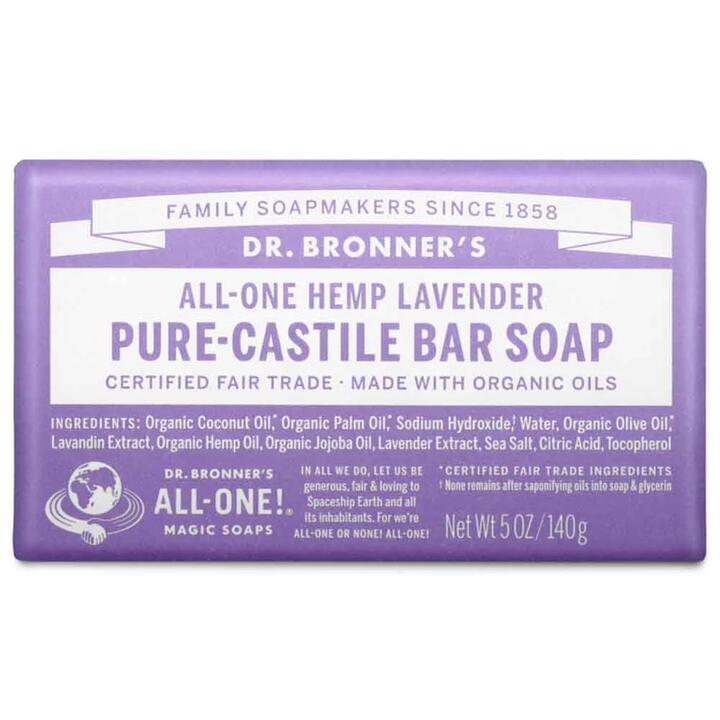 Dr Bronner’s Original Castile Bar Soap in Lavender.Relaxing and Calming Lavender. Scented with pure lavender and lavandin oils to calm the mind and soothe the body! Dr. Bronner’s Lavender Bar Soap is made with certified fair-trade ingredients and organic hemp oil for a soft, smooth lather that won’t dry your skin. 100% biodegradable in a 100% post-consumer recycled wrapper.Dr. Bronner’s Pure-Castile Bar Soaps are biodegradable, vegan, gentle and versatile. Great for washing your body, face and hair!