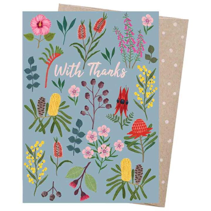 Earth Greetings Greeting Card Thank You Wildflowers features beautiful botanical illustrations of Australian artist Negin Maddock.Blank insideMatte finishSize: 155 x 110mmAustralian designed & madePrinted with VOC-free ink100% post-consumer recycled paper card and envelopeAbout the ArtistNegin Maddock is an illustrator and printmaker based in Sydney, Australia who creates beautiful hand illustrated art that celebrates Australia’s unique flora and fauna.
