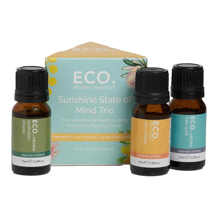 ECO. Modern Essentials Sunshine State of Mind Essential Oil Trio is a selection of essential oil blends to bring light to your day. Create an inspiring, fresh and uplifting atmosphere in your home by diffusing one of these delicious smelling blends. Feel instantly refreshed and energised.Includes:Free Spirit Essential Oil Blend:An exotic blend of sweet orange, ylang ylang, patchouli and lime to help inspire individuality. Diffuse this gorgeous essential oil blend helps evoke feelings of confidence and freedom of mind.Sun-Kissed Essential Oil Blend:Designed to uplift, refreshing and cleanse. This oil is reminiscent of summer with a blend of grapefruit, bergamot and lime to bring joy in your home.Australian Shores Essential Oil Blend:Be inspired by this gorgeous blend of lemon, eucalyptus, vanilla and tea tree to find your own tranquility. Inspired by natural Australian botanicals and native plants, this subtle scent will transform your home or office into a relaxing inner sanctum.