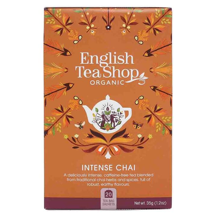 An organic, fairtrade Intense Chai that’s a caffeine-free blend of traditional Chai herbs and spices. Enjoy it with a dash of mylk of your choice and sugar or on its own. There are 20 Tea Bags in a Box.Â