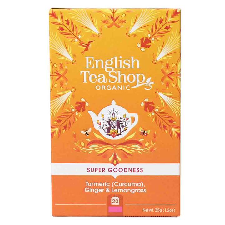 English Tea Shop Super Goodness Turmeric, Ginger & Lemongrass Tea. An organic, fairtrade fragrant blend of Turmeric, Ginger and Lemongrass. This rich and robust tea can be enjoyed with a bit of sugar or on its own. There are 20 Tea Bags in a Box. Certified organic by The Soil Association and Fairtrade International.