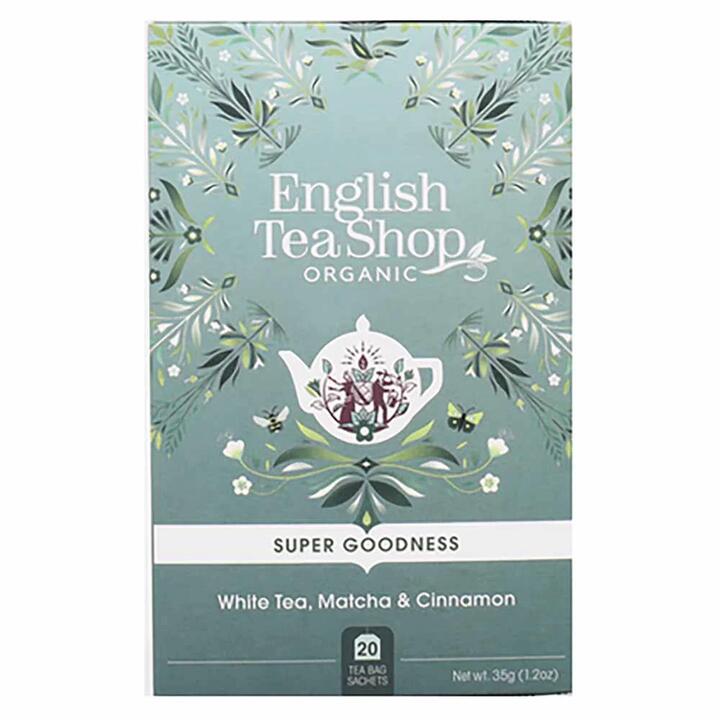 English Tea Shop Certified Organic Super Goodness White Tea, Matcha & Cinnamon Tea An organic, fairtrade White Tea, Matcha and Cinnamon Tea that is a powerful blend of full and fresh flavours. It’s the perfect afternoon tea to help you unwind. There are 20 Tea Bags in a Box. Certified organic by The Soil Association and Fairtrade International.