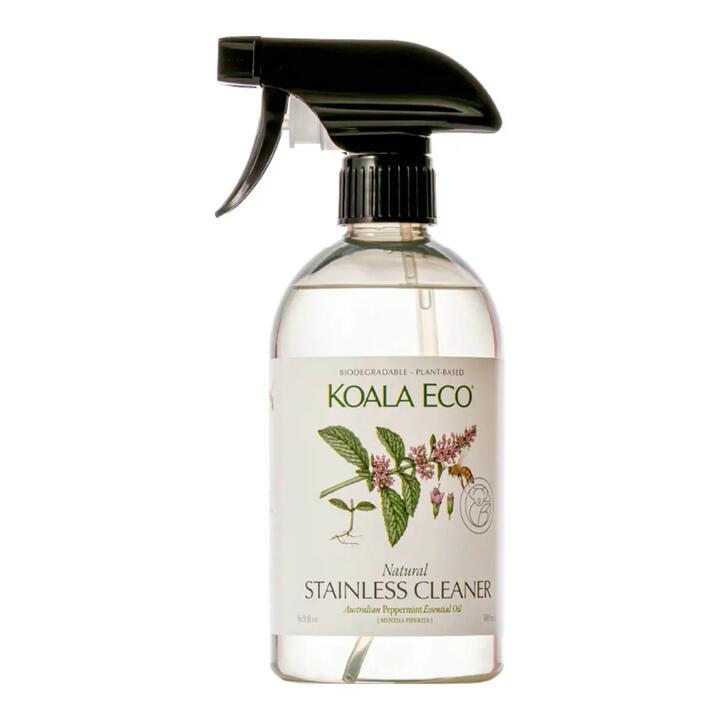 Koala Eco Natural Stainless Steel & Chrome Cleaner, to Polish and Protect, with Peppermint. This plant based, powerful cleaner, is made with Peppermint Essential Oil and polishes and protects your stainless steel and chrome-plated surfaces in the kitchen, bath and laundry area. It kills germs and harmful bacteria without the need for toxic chemicals. Free of Dyes, Phosphates, SLS, Chlorine and other nasties. The energy of menthol, and all the zest of mint. Let nature’s antiseptic energise your spirits as it cleans and protects your home. Kills 99.9% of germs Natural & non-toxic Effective & powerful Natural disinfectant No synthetic fragrance Plant-based Eco-friendly Vegan & cruelty free Palm oil free Made in Australia Koala Eco products are packaged in recyclable 100% post-consumer recycled bottles, meaning there are no new plastics created with each bottle.