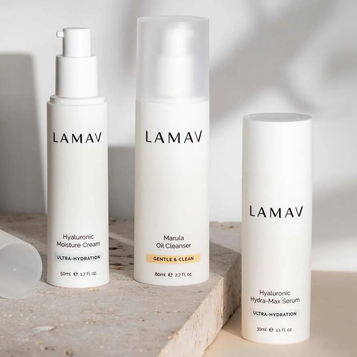 LAMAV Hydration Skincare Essentials Pack, For Normal, Dry & Sensitive Skin Types LAMAV’s Hydration Skincare Essentials Pack contains a cleanser, serum and moisturiser for your skincare routine, suitable for normal, dry and sensitive skin. This set contains: LAMAV Gentle & Clean Marula Oil Cleanser (80ml) A purifying blend of oils that work to cleanse the skin for a radiant complexion, suitable for normal, dry and sensitive skin. Formulated with Marula Oil, Raspberry Seed Oil and Jojoba Oil to gently remove makeup and impurities while leaving the skin feeling hydrated and soft. Excellent for skin that is prone to fine lines and dehydration. LAMAV Hydration Hyaluronic Hydra-Max Serum (30ml) Formulated to help rehydrate and preserve moisture in the skin, suitable for dry and sensitive skin. Developed with Hyaluronic Acid, Coenzyme Q10 and Quandong to rehydrate while restoring skin texture. Excellent for skin prone to dehydration. LAMAV Hydration Hyaluronic Moisture Cream (50ml) An ultra-hydrating day cream to soothe and rehydrate skin for a radiant complexion, suitable for dry and sensitive skin. Formulated with Hyaluronic Acid, Phytosterols and Sandalwood Seed Oil to soften and moisturise skin while calming red or irritated skin. Excellent for skin prone to dehydration. Certified Organic by the OFC. Vegan and cruelty free. Made in Australia. Packaged in a recyclable cardboard box and recyclable plastic bottles.