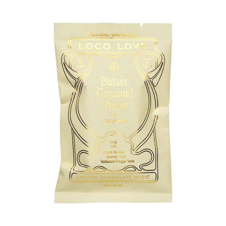 Loco Love Butter Caramel Pecan Chocolate features golden, gooey butterscotch caramel at its highest frequency – chewy, smooth, lightly sweetened and encased in a rich cacao shell. Lightly dusted with antioxidant-rich cinnamon sugar and found within a crisp, organic maple-roasted pecan – our most popular truffle bar earned its status for good reason: a flavour to live for.