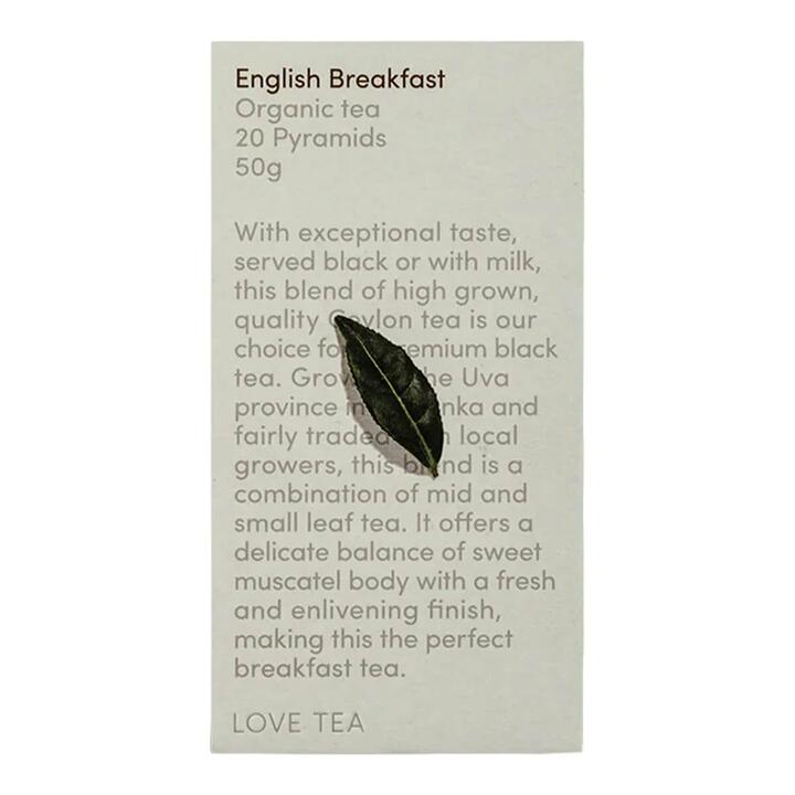 Love Tea English Breakfast Pyramid Tea Bags offers exceptional taste, whether served black or with milk. This blend of high-grown, quality Ceylon tea in convenient pyramid tea bags is a premium choice for black tea lovers.