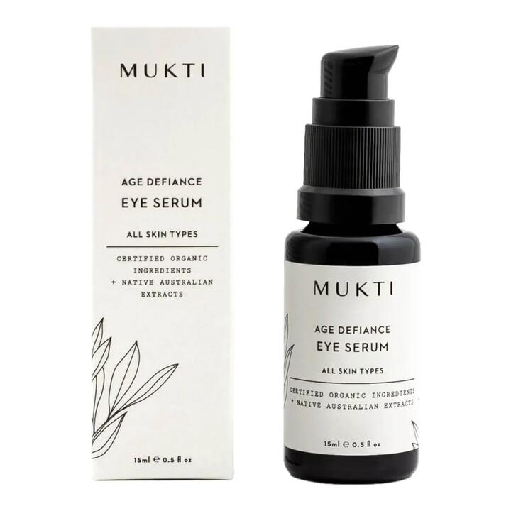 Mukti Age Defiance Eye Serum is an anti-wrinkle eye treatment with natural and native ingredients that help reduce the appearance of ageing by hydrating and smoothing wrinkles and fine lines in the eye area.A highly compatible combination of essential fatty acids and native Australian extracts mega boosted with antioxidants, peptides and vitamins for visible age reversal around the eye area*. Enhances skin elasticity and smoothness combating fine lines, puffiness and dark circles around the eye area.*Clinical studies of twice a day treatment resulted in the severity of the wrinkles around the eyes decreasing up to 17% in 15 days and 27% in 30 days of treatment.Key Ingredients: Eyeseryl: A tetrapeptide that reduces eye puffiness, under-eye bags, and dark circles for an improved eye contour appearance. It works by decreasing glycation activity minimising the appearance of dark circles and reduces lipid accumulation, which is linked to fat-related eye bags. Serilesine: A firming active ingredient that promotes double cell binding activity on the keratinocytes and fibroblasts, resulting in a re-densifying and restructuring effect increasing elastin and firming the skin. Argireline: Anti-wrinkle peptide that smooths the skin and expression lines by destabilising SNARE complex*. *Decreased wrinkle volume by 20.6% and length by 15.9% after 1 week. Reduction of 17% in wrinkle depth after 15 days. 20% reduction in wrinkle volume and 15% reduction in wrinkle depth over 60 days. Sea Buckthorn Berries: Sea buckthorn is a superfood and potent antioxidant. It provides hydration, evens out skin tone, and improves the appearance of fine lines and wrinkles. It contains approximately 108 bioactives including abundant levels of Vitamin C, A, B, E, K and P as well as essential fatty acids 3,6,9 & 7, carotenoids, flavonoids, lycopenes, phytosterols and minerals. Together, these ingredients help protect the skin against free radical damage while simultaneously improving dryness and helping to support the skin barrier. Co Q10 Ubiquinone: Co Q10 is a nutrient and fat-soluble substance that plays an essential role in cellular function as an antioxidant. It nourishes and reinforces the skin replenishing the natural lipid barrier and preventing transepidermal water loss (TEWL). Research shows beneficial effects include diminished signs of wrinkle depth and visible signs of photoageing. This product has a base containing 70% certified organic ingredients with peptides added for their robust corrective effects. These peptides are toxin-free and rate low on the EWG database making this an ideal organic based alternative to traditional anti-ageing cosmeceuticals.Vegan. Gluten-free. Palm oil-free.Made in Australia. Packaged in biophotonic glass.