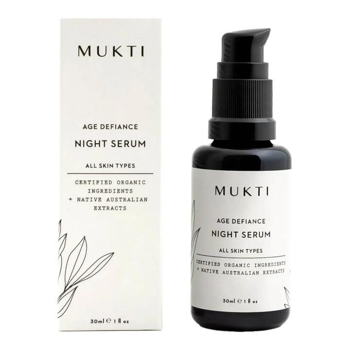 Mukti Age Defiance Night Serum is a gentle, exfoliating anti-ageing night serum that assists the skins repair and rejuvenation process.This potent renewal serum smooths the appearance of fine lines and wrinkles and may assist acne.Key actives such as Bakuchiol and Papaya Enzyme promote a refined complexion that exudes luminosity and brightness.Key Ingredients: