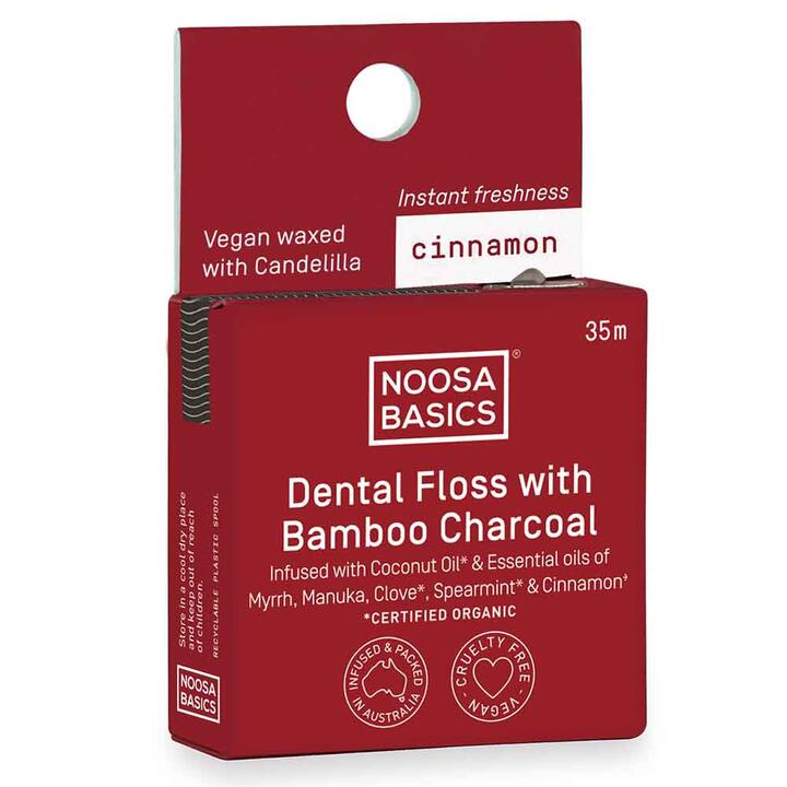 Noosa Basics Dental Floss with Bamboo Charcoal – Ginger + Cinnamon is a vegan dental floss made with activated charcoal infused in a blend of Organic Virgin Coconut Oil and 100% Pure Essential oils of Myrrh, Clove, Manuka, Cinnamon and Ginger. It freshens your mouth, cleans your teeth and helps to heal your gums.