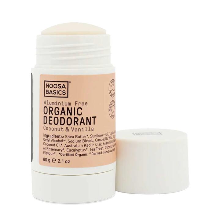 Noosa Basics Deodorant Cream Stick – Coconut & Vanilla is made with organic Tapioca and Australian kaolin clay that absorb moisture while allowing you to sweat and release toxins. Bicarb soda kills the bacteria that causes odour. Shea butter and candelilla wax nourish your skin and organic coconut oil is well known for its antibacterial properties. This deodorant has the power of a paste but in an easy to apply. Coconut has a beautiful holiday scent and is sweetened with vanilla. With only 10 ingredients and free of aluminium and parabens. 100% Natural with certified organic ingredients Neutralises odour fast Lasts all day whether in the office or working out A deodorant paste that is invisible after application Aluminium free, alcohol free, paraben free Vegan and certified cruelty-free Hand made in Australia in small batches