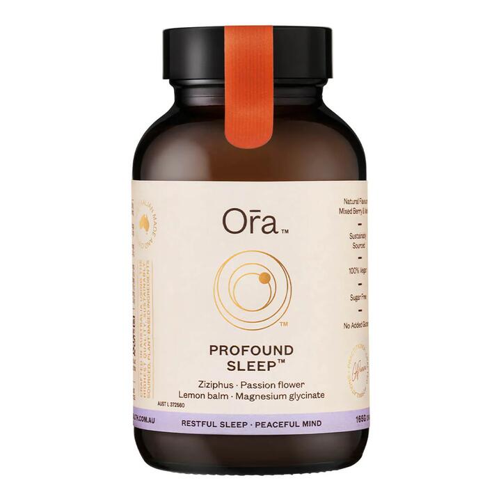 Ora Profound Sleep is a powerful combination of gut-friendly magnesium glycinate with sleep-promoting herbs to reduce the time taken to fall asleep, support deeper sleep, and relax the body and mind before bed.