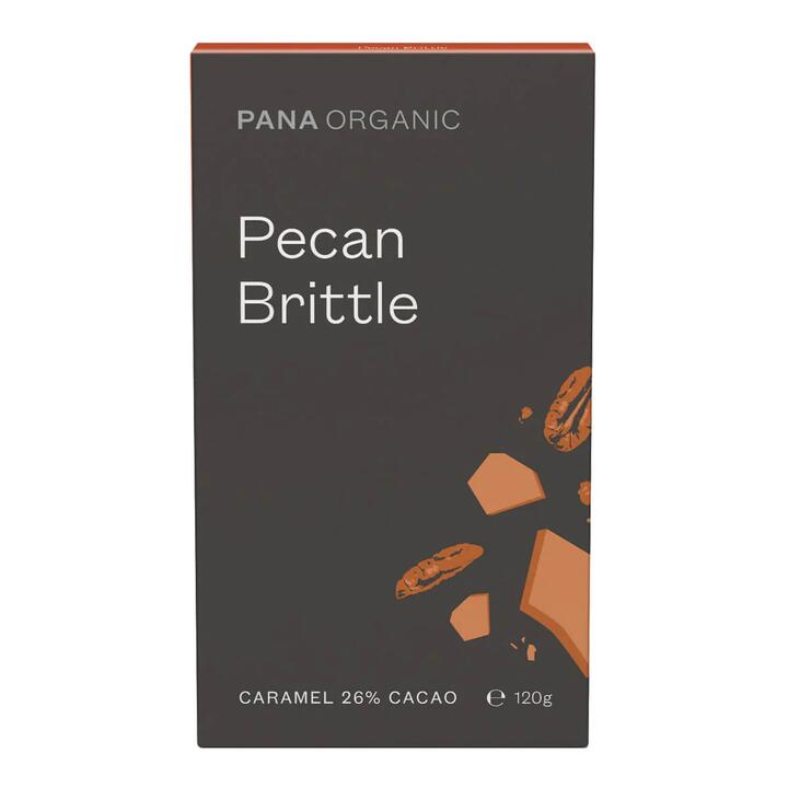 Pana Organic Pecan Brittle is a velvety caramel chocolate blended with crunchy roasted pecans and chewy toffee.