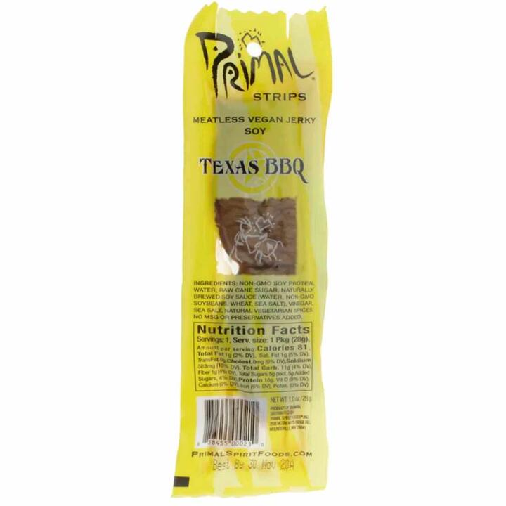 Primal Strips Texas BBQ Jerky Primal Strips are a delicious plant-based jerky made of soy, seitan and shiitake mushrooms. They’re more than just a tasty midday snack, try adding them in salads, stir-fries and burritos! High in energy & protein All-natural Vegan/kosher No preservatives No artificial colours Non-GMO Founded in 2001, Primal Spirit Foods have crafted high-quality plant-based meat alternatives such as their vegan jerky. Their philosophy is to live more harmoniously with the environment and our fellow living beings.