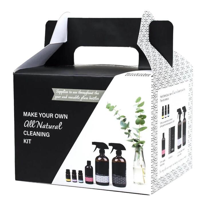 Each beautifully packaged kit contains everything you need to make your own natural cleaning products, a non-toxic solution to household cleaning products that are typically full of harsh chemicals.