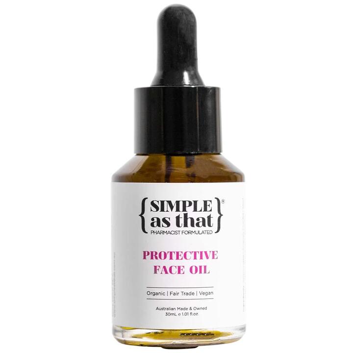 Simple As That’s Protective Face Oil is vegan, cruelty-free, natural, fair trade and Australian made by a pharmacist; suitable for sensitive skin types. It has been formulated with naturally sourced ingredients, such as Raspberry Seed Oil, to nourish and protect the skin.