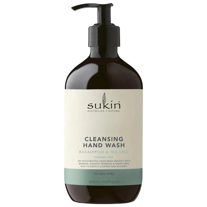 Sukin Cleansing Hand Wash, Eucalyptus & Tea Tree, suitable for all skin types. The Sukin Cleansing Hand Wash is designed to gently remove impurities from the hands, without drying or stripping the skin. A rich blend of Borage, Evening Primrose & Grape Seed delivers moisture to dehydrated hands. Whilst Aloe Vera, Witch Hazel & Sage leaves skin feeling clean, hydrated and supple.