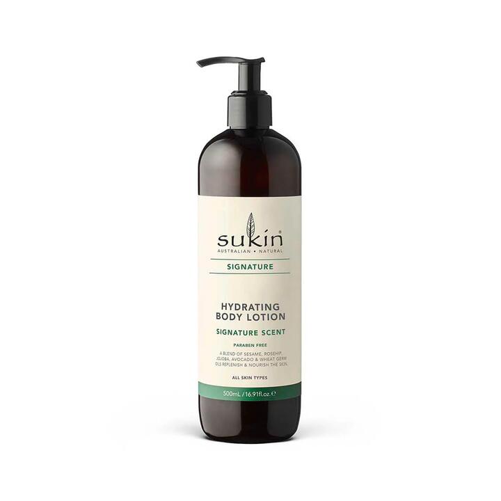The Sukin aromatic Signature Hydrating Body Lotion Signature Scent replenishes and nourishes the skin’s moisture barrier through its rich blend of Sesame, Rosehip, Jojoba, Avocado and Wheat Germ Oils.
