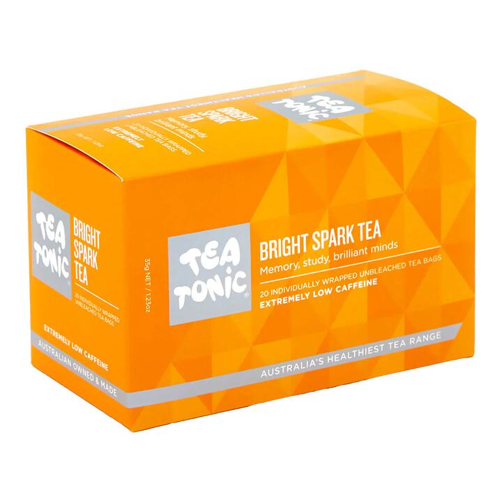 Tea Tonic Bright Spark Tea is a blend that can help with learning and concentration. The herbs of bacopa, gingko and white tea work in synergy to help you achieve the best your mind can be. Sweet & herbal Gluten free Low caffeine Vegan friendly Flavour: Slightly sweet twist on white tea.