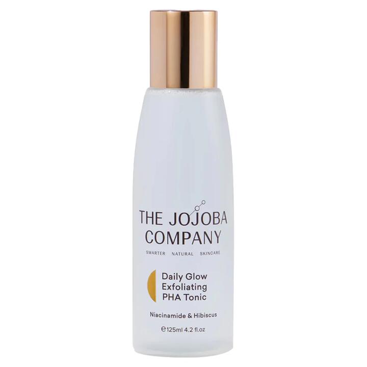 The Jojoba Company Daily Glow Exfoliating PHA Tonic is a hydrating and radiance-boosting acid toner that is a powerhouse blend of gentle active ingredients to exfoliate and hydrate the skin while maintaining a healthy skin barrier.Slow-release poly hydroxy acids (PHA 6%), niacinamide (2%), hibiscus, finger lime and jojoba leaf extract work together to gently exfoliate the surface of skin while providing deep hydration and barrier repair. The result is a brighter, smoother, healthier and a more glowing complexion.