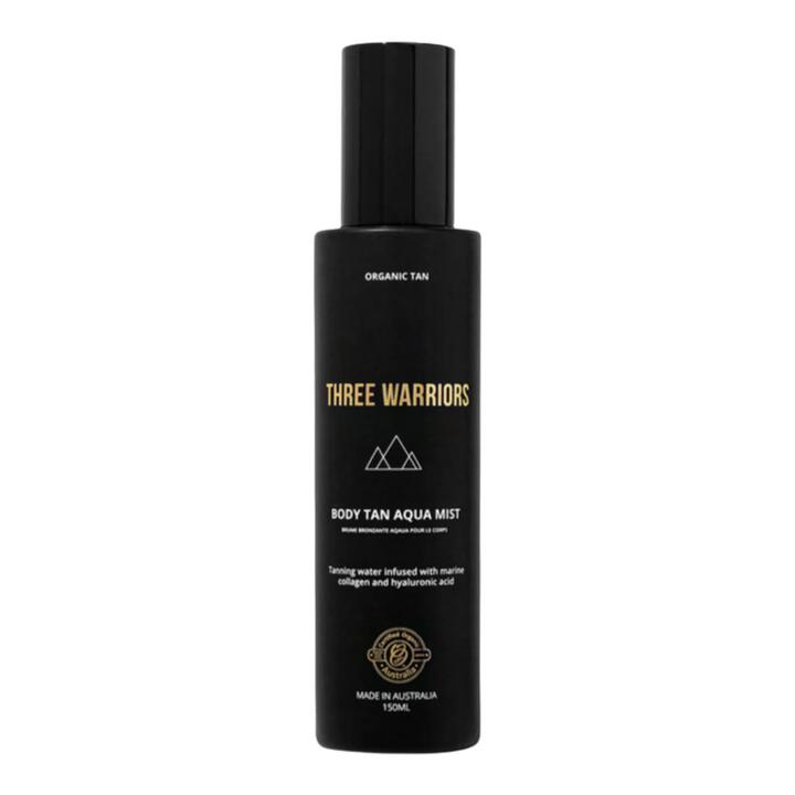 Three Warriors Body Tan Aqua Mist is a certified organic transparent tanning water made to refresh, hydrate, and give your skin that summer glow. Infused with Tasmanian spring water, hyaluronic acid, and marine collagen, this lightweight mist is designed to revitalise your skin while delivering a dewy, sun-kissed finish, perfect for achieving a natural-looking tan without the mess.