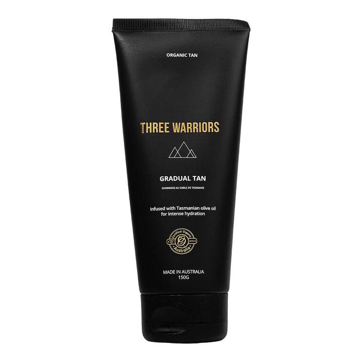 Three Warriors Gradual Tan is an organic, vegan and cruelty-free self-tanner, made from natural ingredients. This gradual self-tanner builds a beautiful golden glow without leaving behind a sticky residue. Infused with a natural lime and vanilla scent, this tanning lotion does not have the traditional fake tan smell. Formulated with natural ingredients such as aloe vera, avocado oil and chamomile extract. Aloe vera locks in moisture and soothes the skin. Avocado oil delivers essential vitamins A, D and E to the skin. Chamomile extract contains anti-inflammatory properties. Easy to use Natural lime & vanilla scent Hydrating, moisturising & nourishing 100% organic and natural Free from preservatives, chemicals and toxins Vegan & cruelty-free Made in Tasmania, Australia Certified Organic by the OFC Packaged in a plastic tube.