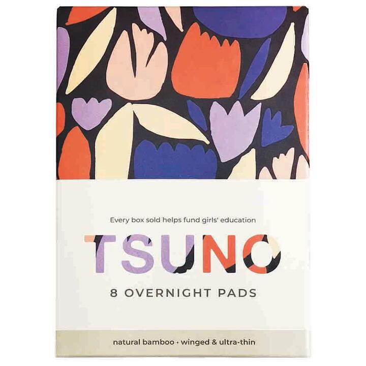 Tsuno Ultra Thin Bamboo Overnight Pads with Wings for Night Use are available online at Flora & Fauna 8 pads per pack. Tsuno pads are made from sustainable natural bamboo and corn fibre. They are chlorine and dioxin bleach free and are even wrapped in biodegradable plastic so you can be sure your product has as little impact on the environment as possible. 50% of the profits from these liners are donated to One Girl, a charity focused on girls education wherever they are in the world. The beautiful packaging that Tsuno pads and tampons arrive in is the work of different artists. The overnight pads feature artwork designed by Lauren Cassar. Tsuno is an impressive brand focused on social initiatives and threads its ethics through its business, which we love. Tsuno make and sell disposable, sustainable bamboo fibre sanitary pads and organic cotton tampons. 50% of their profits are donated to charities that focus on empowering women, with the main focus being education and menstrual support. They are an impressive company we are proud to range at Flora & Fauna.