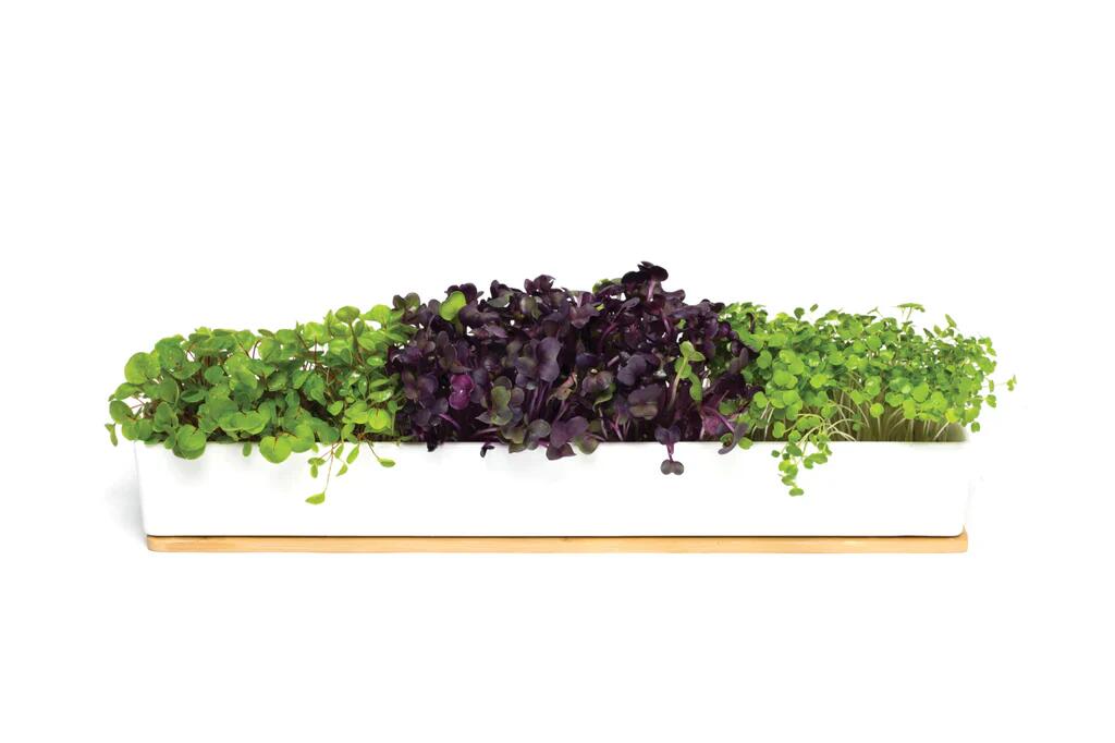 Urban Greens Microgreens Windowsill Grow Kit.Microgreens are tiny delicate greens that are big on nutrition and flavour. They are the perfect crop for the urban gardener who is limited to tiny spaces or a windowsill. Stay up with the latest fine dining restaurant or speciatly food store and grow your own.This Urban Greens Grow Kit contains everything you need to grow a windowsill full of microgreens! The kit includes:A beautiful porcelain windowsill box with bamboo lid and drip tray. Size: 40 x 8 x 7cm3 microgreen varieties – Rocket, Broccolo and Radish sprouting seedsSustainable organic coir propogation mixGrowing instructions and “hot tips”