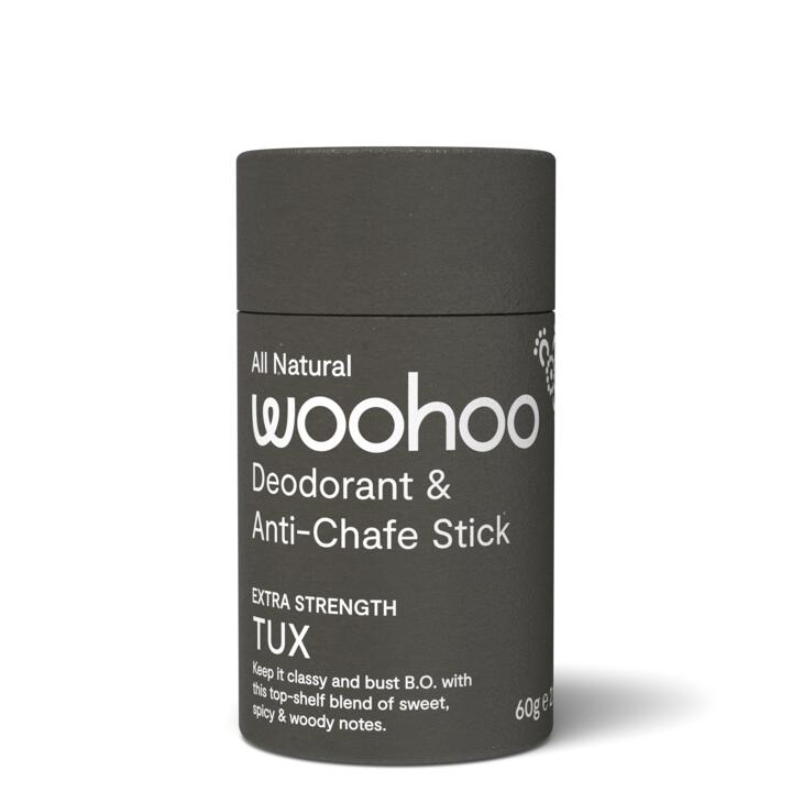 Woohoo! All Natural Deodorant & Anti-Chafe Stick – Tux, Extra Strength in a Cardboard Tube The 100% natural, 100% effective Woohoo Tux is all class. This extra strength all natural deodorant will banish body odour in style, keeping you fresh all day and into the night. The bergamot and patchouli scent is a top-shelf blend of sweet, spicy and woody notes.